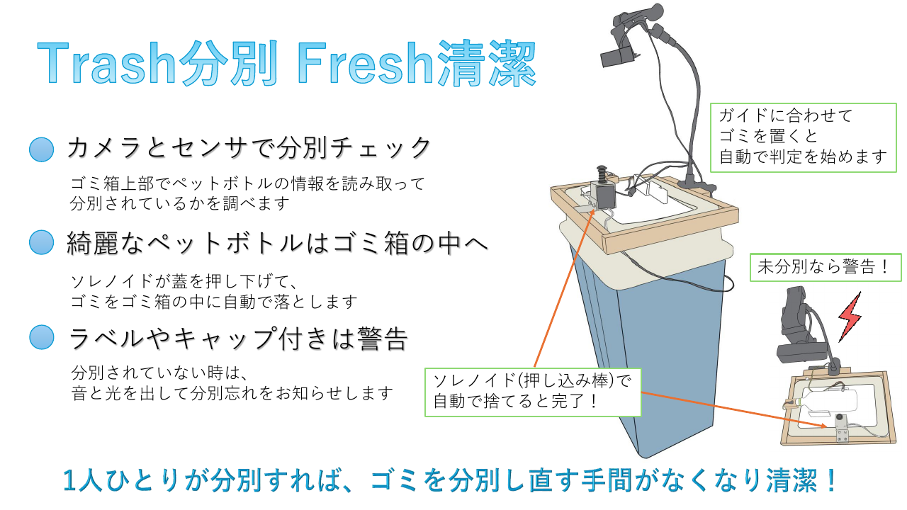 Trash分別 Fresh清潔 カメラとセンサで分別チェック. ラベルやキャップ付きは警告 |